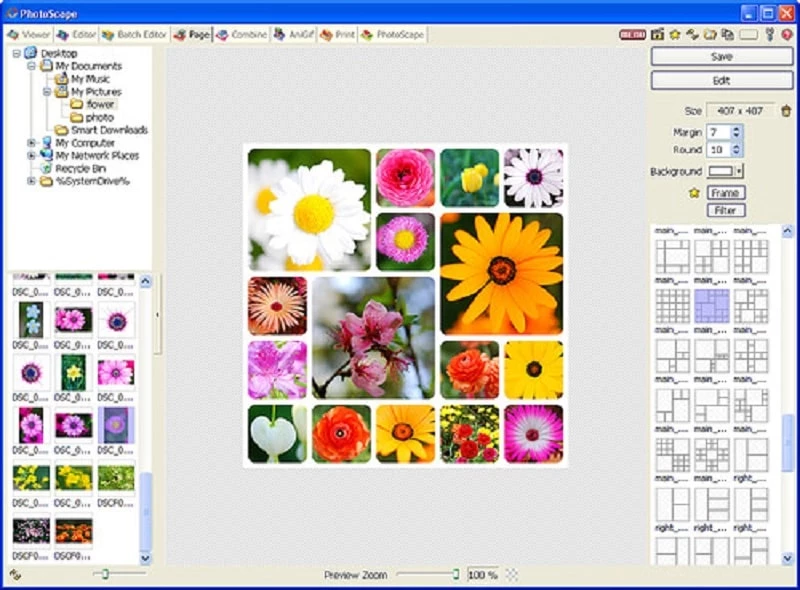 يوفر التطبيق أيضًا تبويبًا للصور المجمعة لدمج عدة صور لإنشاء صورة واحدة، وتنظيمها داخل إطارات الصفحة. علاوة على ذلك، يمكنك إنشاء صور بانورامية خلابة من خلال ربط الصور عموديًا أو أفقيًا.